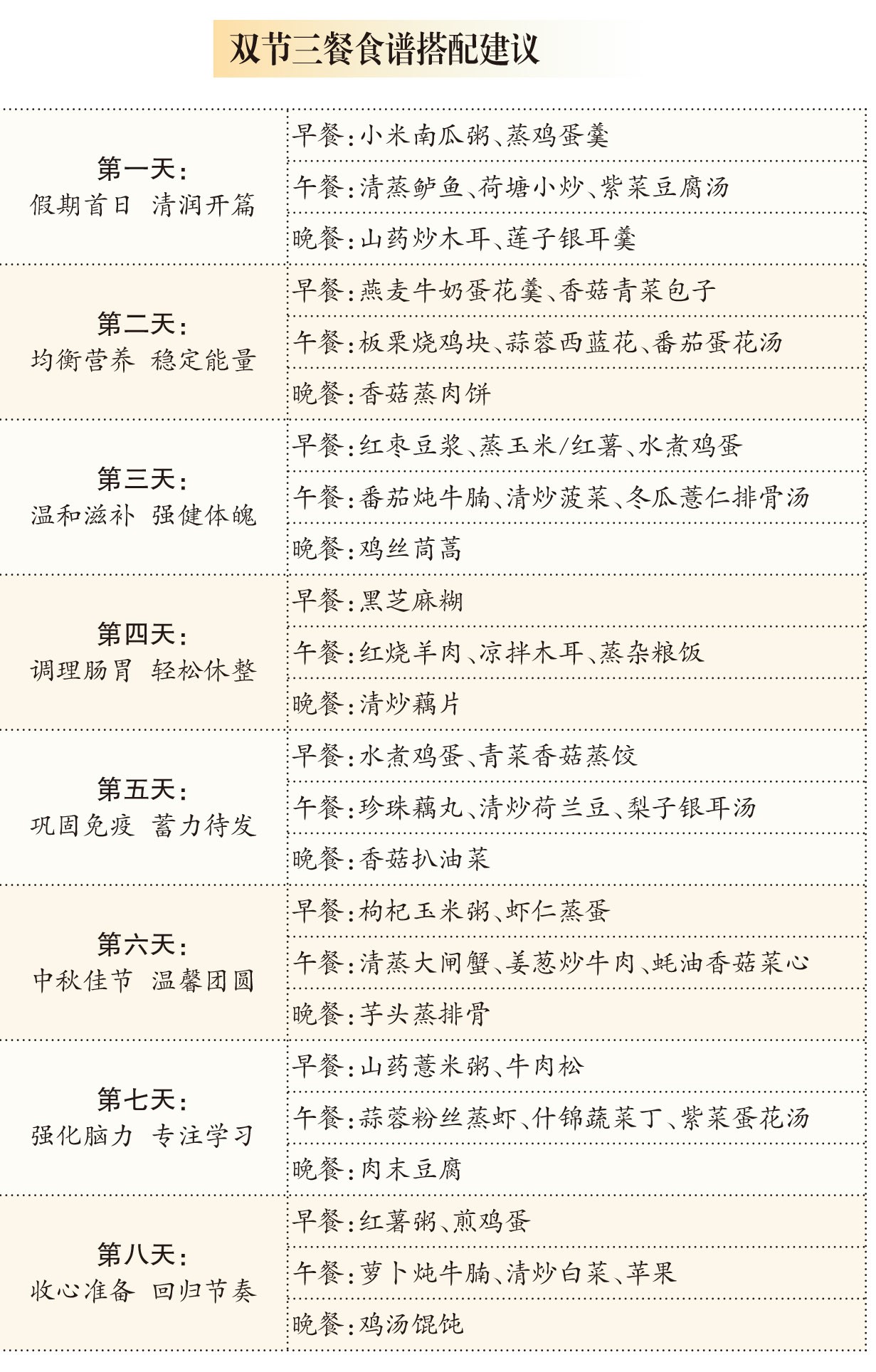 眼下气温逐渐转凉,高三生既要逐步适应高强度的备考节奏,又要接受气候转变带来的身体代谢变化,可谓双重挑战在身。下周,高三生将迎来国庆与中秋双节连休的8天假期,家长们不妨提前琢磨下假期食谱,本着顺应时令的思路,用营养均衡、配比合理的假期餐助力孩子增强体质,为一轮备考充分蓄能。