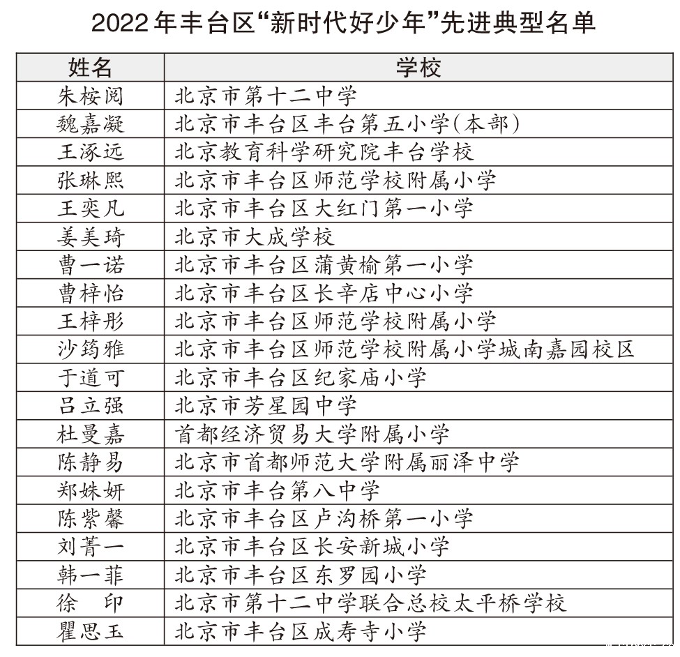丰台区按照首都文明办《关于深入开展新时代“学习和争做美德少年”》的要求,持续开展“新时代好少年”学习宣传活动,通过学生自荐、同学互荐,以及老师、家长和社会推荐,推出了一批事迹突出的青少年典型。此次活动全区共推选近100名好少年候选人,相关成员单位组成评审组,20名学生当选“丰台区新时代好少年”、20名学生提名“丰台区新时代好少年”,该活动旨在引导广大未成年人向上向善、孝老爱亲,从小立志向、有梦想,努力成长为担当民族复兴大任的时代新人。