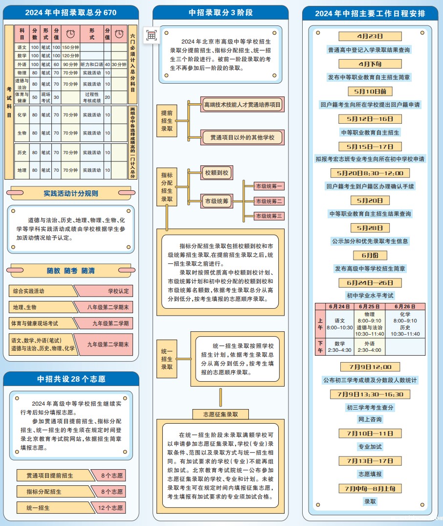 2024年,北京继续实施初中学业水平考试,将初中毕业考试和高级中等学校招生考试“两考合一”。中招录取总分为670分。今年继续实行考后知分填报志愿,每名考生最多可填报28个志愿。