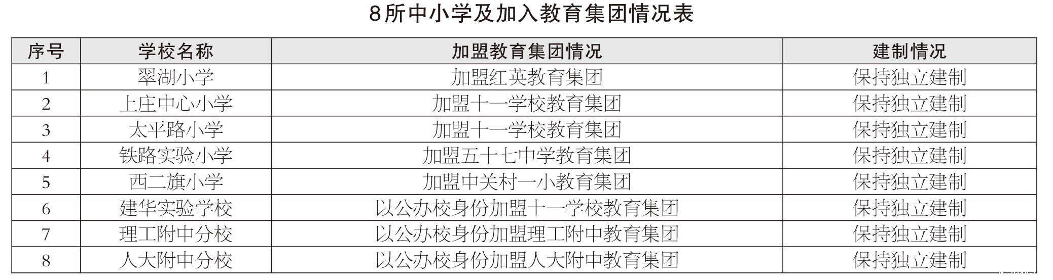 此外,在上半年推进“公参民”学校规范工作的基础上,10月以来,为推动理工附中分校、人大附中分校、建华实验学校等3所“民转公”学校在新的起点上持续提升,海淀区将人大附中分校纳入人大附中教育集团,将理工附中分校纳入理工附中教育集团,将建华实验学校纳入十一学校教育集团,实现集团内的资源、课程、师资的高效共享。