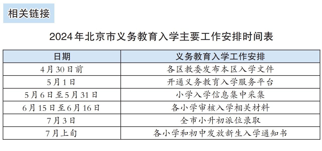 今年北京市义务教育入学重要时间安排与往年保持一致:5月1日开通义务教育入学服务平台,5月6日至5月31日进行小学入学信息集中采集。6月15日至6月16日各小学审核入学相关材料。7月3日全市小升初派位录取。7月上旬,各小学和初中发放新生入学通知书。