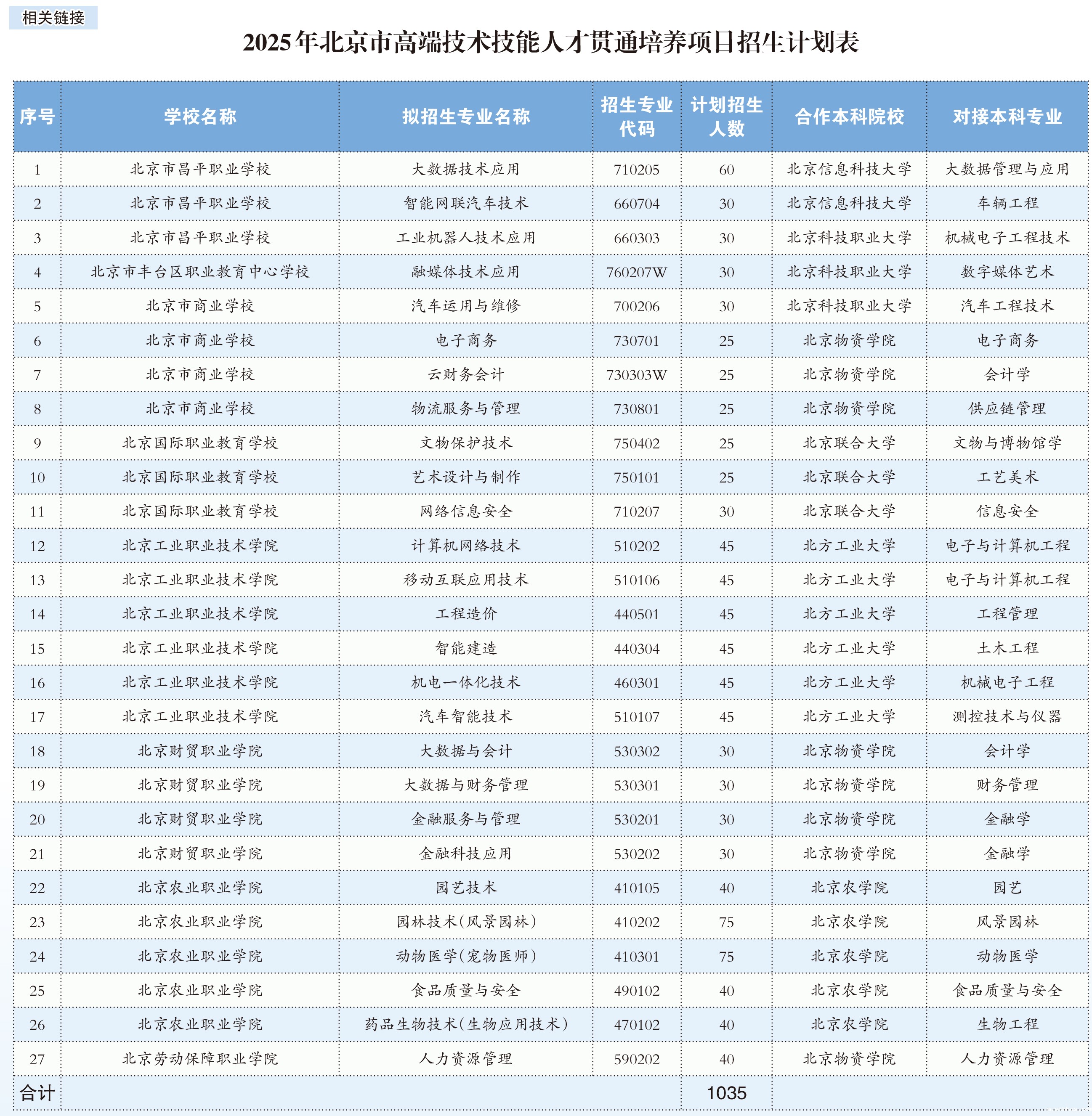 2025年北京市高端技术技能人才贯通培养项目招生计划表