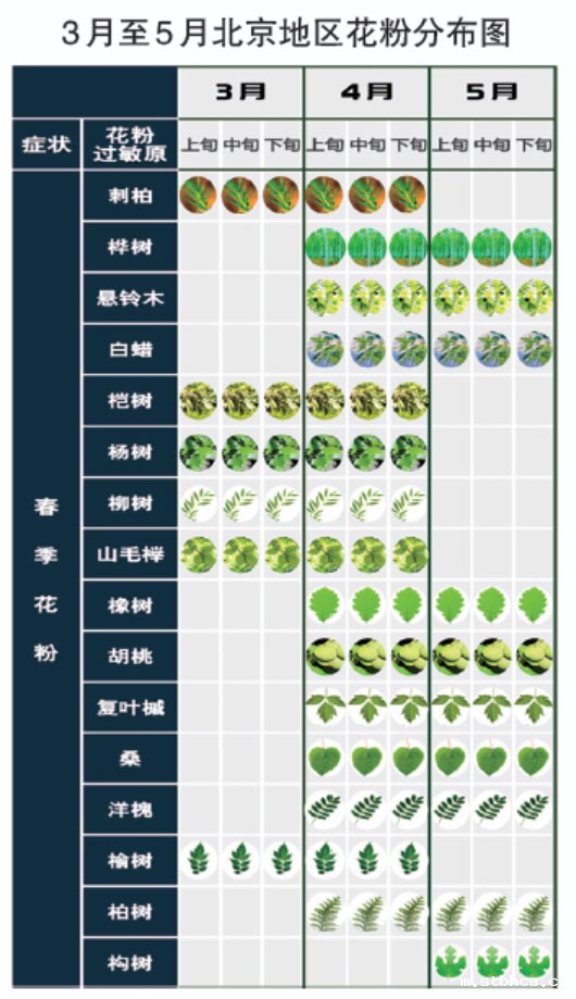 关注花粉预警:大家可通过“花粉监测”小程序查看每日浓度,该程序可显示每个区实时花粉浓度,如当日花粉浓度>100粒/千平方毫米时,建议易敏人群减少外出。(春季北京地区致敏花粉分布情况见右图)