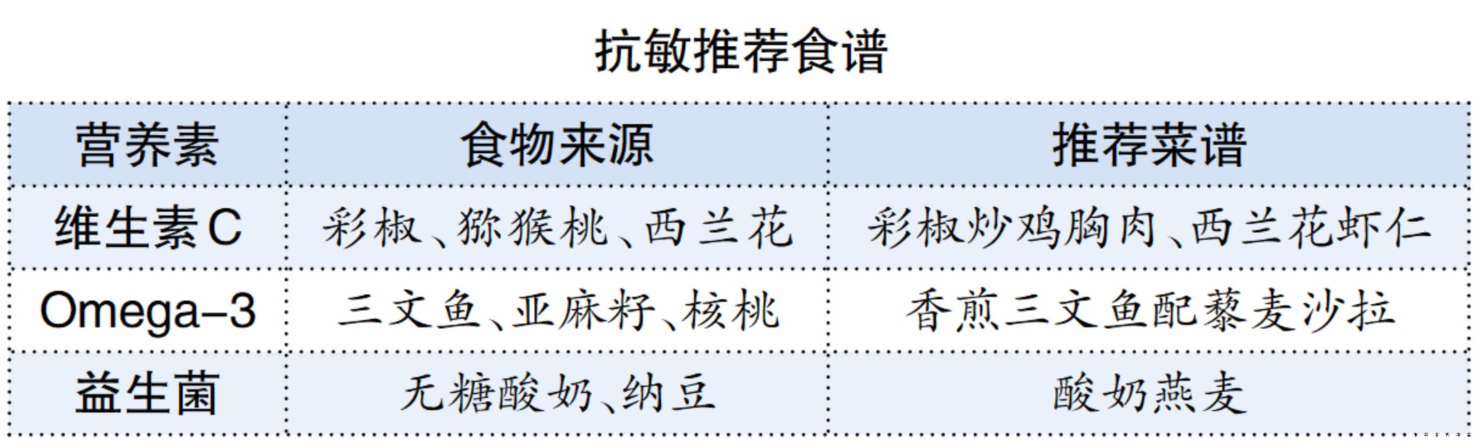 1.饮食调整:现阶段,考生在餐食选择上不仅要避免辛辣,还要规避可导致自身过敏的吃食,如有些患者明确自身对芒果、海鲜、菠萝、牛奶等食物、饮品过敏,食入或接触即有皮肤瘙痒、皮疹甚至诱发严重过敏反应,就须严格避免接触。对于既往无食物过敏者,可科学搭配食物,增强自身免疫力。具体食谱见下表。