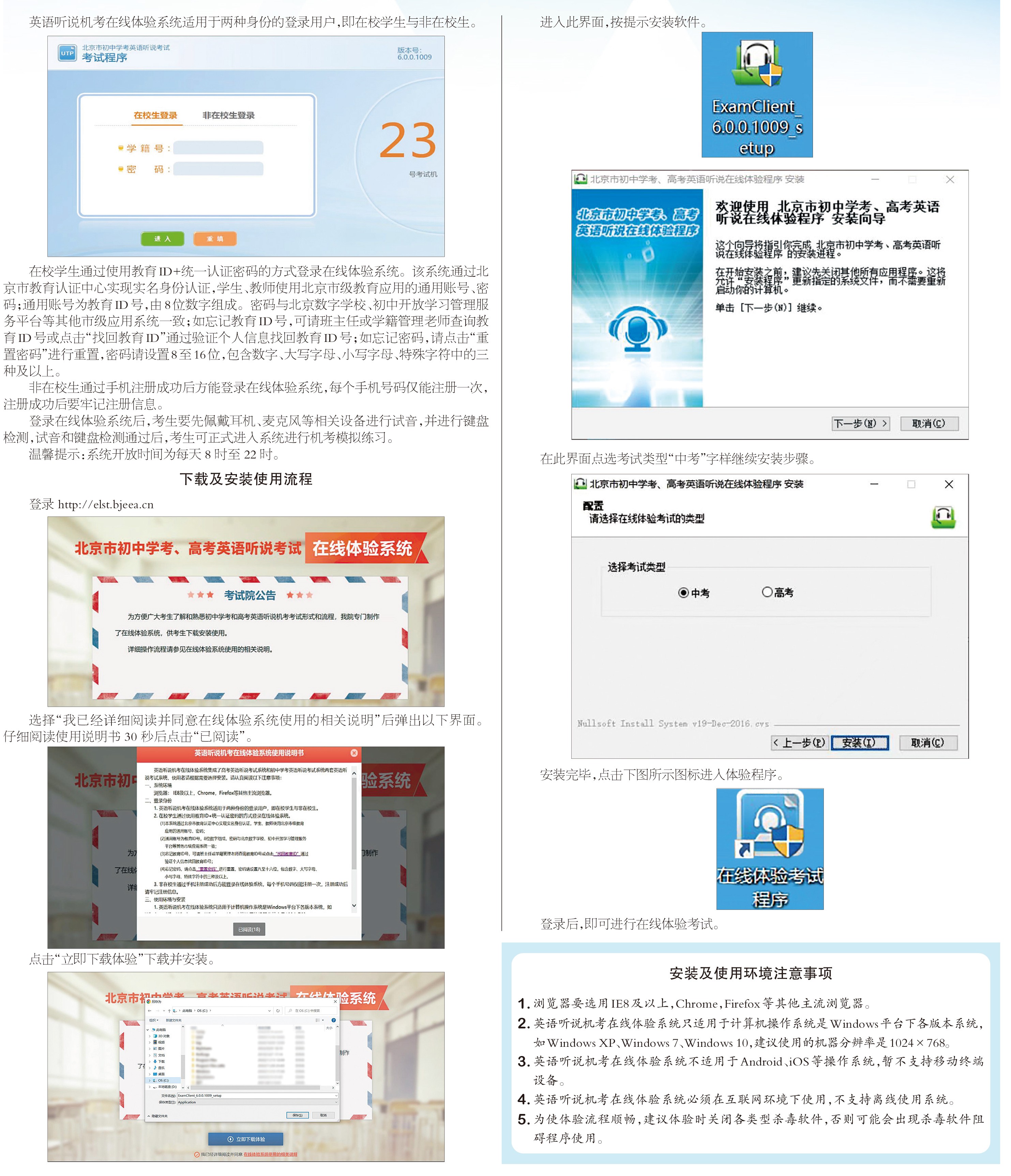 为方便考生熟悉英语听说机考的形式和流程,优米国际娱乐专门制作了“北京市初中学考、高考英语听说考试在线体验系统”。考生可通过登录网站(elst.bjeea.cn)下载安装英语听说机考在线体验考试系统,自主练习。建议考生在考前多体验练习,熟悉考试系统。