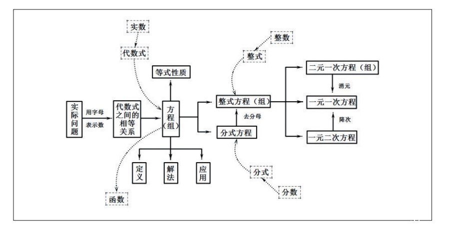 例如,在复习方程和方程组时,把方程(组)的学习过程、分类以及方程(组)与数、式、函数之间的联系等用下图展示出来。