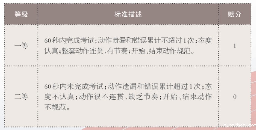考生在 60 秒内完成相应动作,得到相应的分值。按规定顺序做完整套动作,动作无遗漏和错误,获得 5 分;出现动作遗漏或错误,扣除相应动作的分值。具体动作对应分值如下: