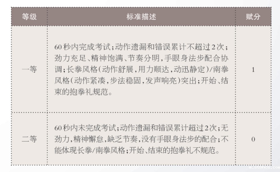 根据考生完成动作时的整体表现判定考生动作表现的等级, 并按相应等级对应的分值赋分。一等赋1分、二等赋0分。