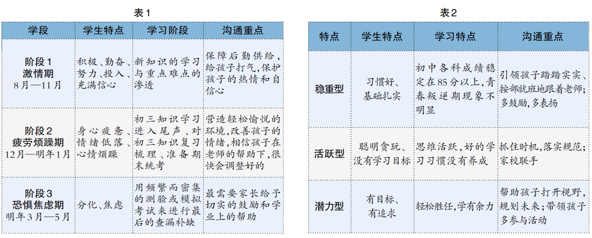 孩子初三这一年伴随着学习进度的推进,在同一学期的不同时间节点上,会有一些情绪和心理的波动。家长要先了解孩子的这种变化规律,观察自己孩子的情绪变化,适时给予正确的引导(见表1)。同时,家长还可结合自己孩子的性格特点,采取不同的引导策略(见表2)。