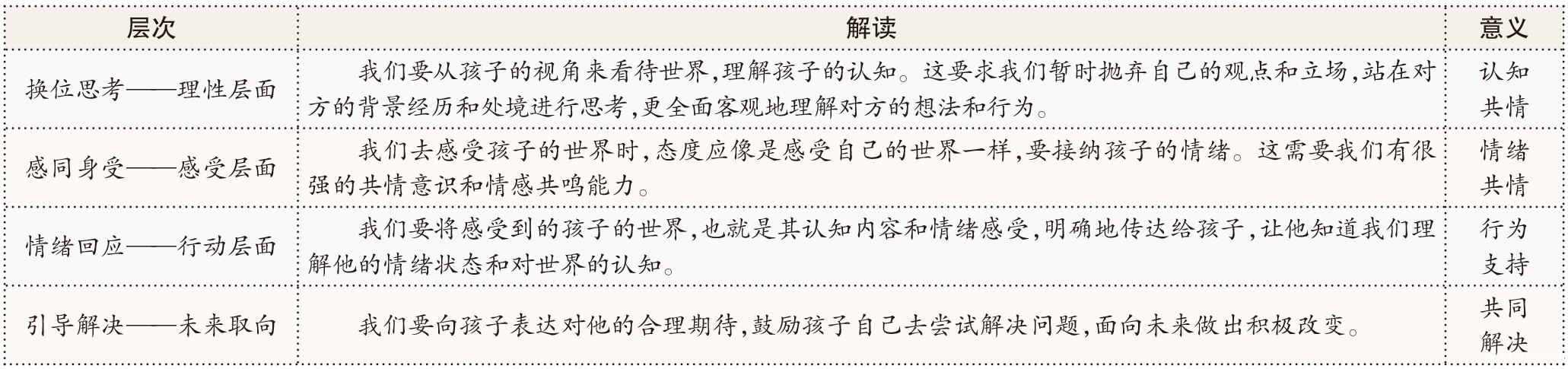 北京师范大学心理学部伍新春教授团队研究的项目将共情分为四个层次,五个步骤。四个层次是换位思考、感同身受、情绪回应、引导解决。五个步骤是停、看、听、说、做。具体解读如表所示。