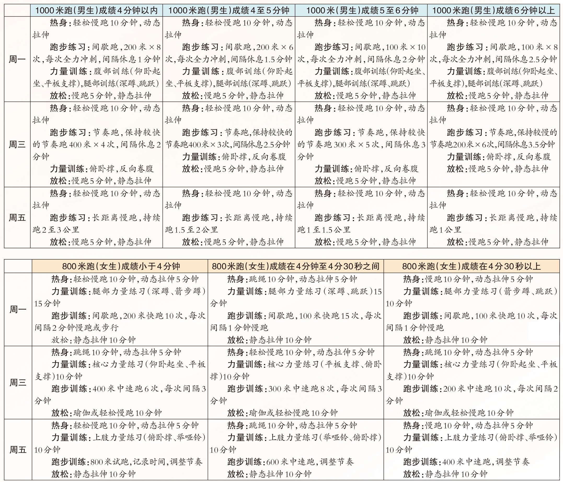 为提高长跑成绩,学生每周都应进行三次训练。为此,笔者为考生制订了具体的训练计划。由于学生存在个体差异,这份长跑训练计划采用分层设计方式,根据不同水平的学生设计了不同的训练方法。学生可以“对号入座”,根据自己的成绩情况,选择适合自己的训练计划。