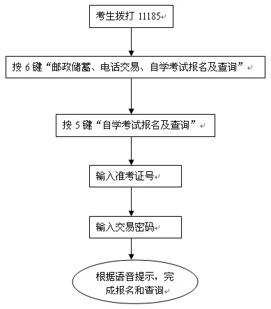 二、 考生进入11185—6“邮政储蓄、电话交易、自学考试报名及查询业务”后,5号键提示“高等教育自学考试报名业务”,进入5号键后,考生即可使用准考证号和交易密码完成考试报名及查询操作。