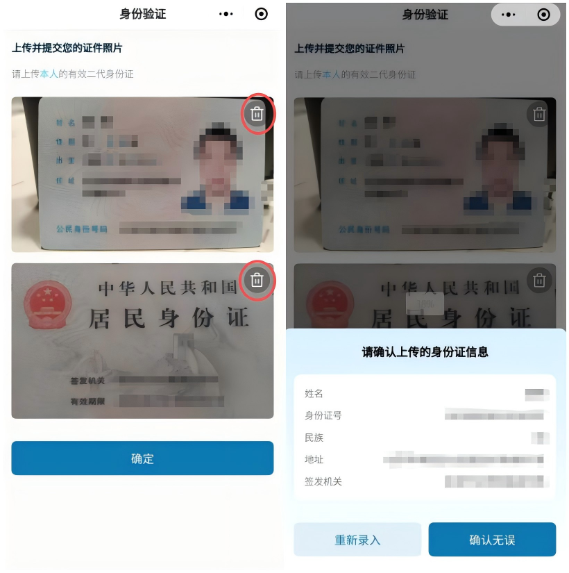 3)上传身份证信息:确保身份证信息清晰无遮挡,检查确认无误后点击“确定”按钮完成上传。若需对已上传的照片进行替换,请点击对应图片右上角的“删除”按钮,删除后重新上传。