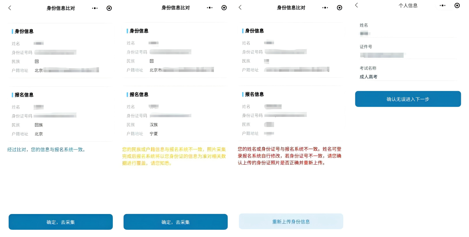 若提示民族或户籍信息与报名系统不一致,考生可继续进行采集流程。照片采集完成后报名系统可能会以身份证的信息为准对相关数据进行覆盖。