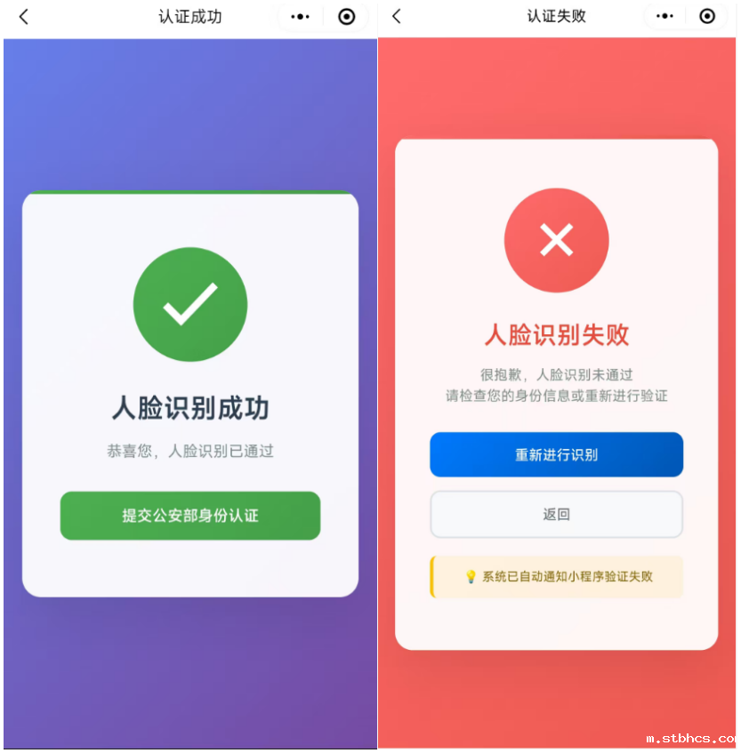 5)人脸识别认证结束后,小程序将自动调用公安部身份证服务进行身份认证。
