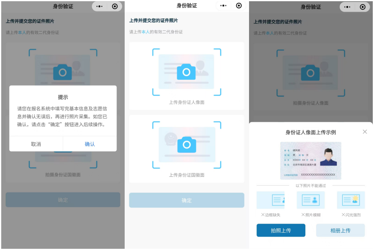 1)上传人像面:点击“上传身份证人像面”,选择“拍照上传”或“相册上传”完成身份证人像面的采集。若拍照上传请确保身份证整体在拍照框内。