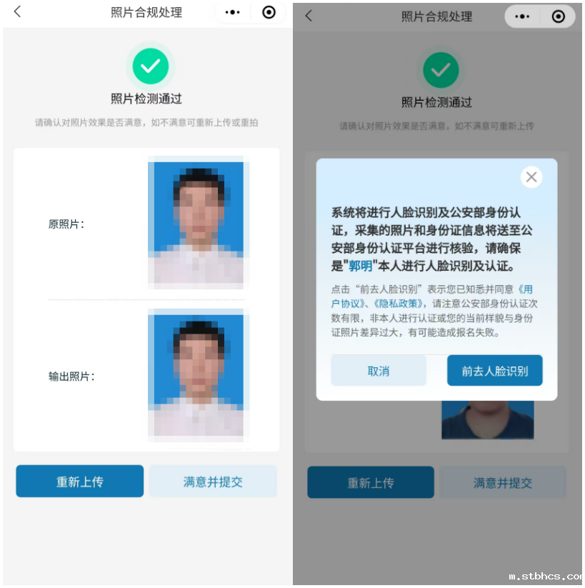 5)确认提交:照片合格后,页面将显示“原照片”及处理后的“输出照片”。若对照片满意请点击“满意并提交”按钮完成提交。若不满意,可继续点击“重新上传”按钮重新选择其他照片。