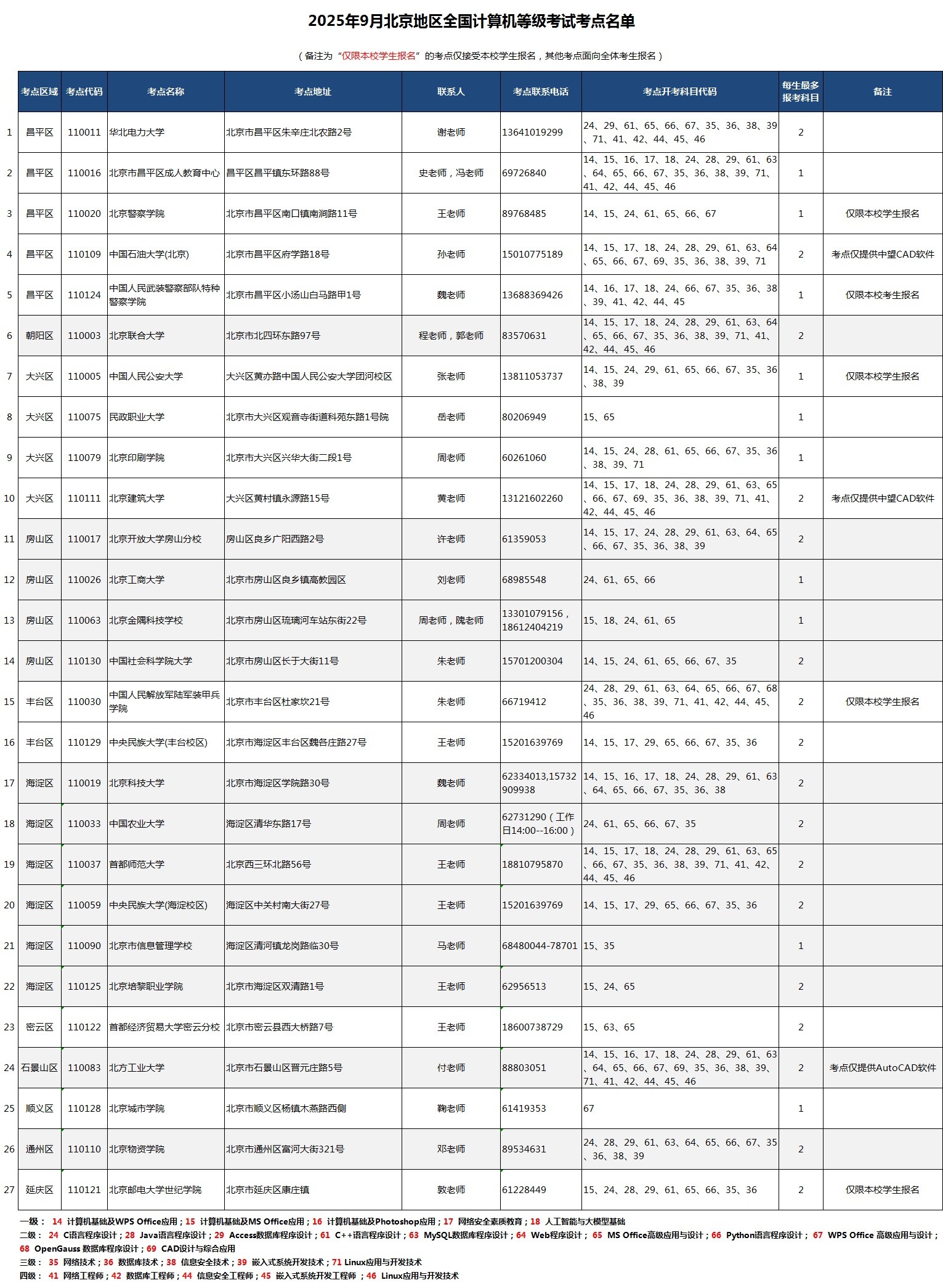 2025年9月北京地区全国计算机等级考试考点名单
