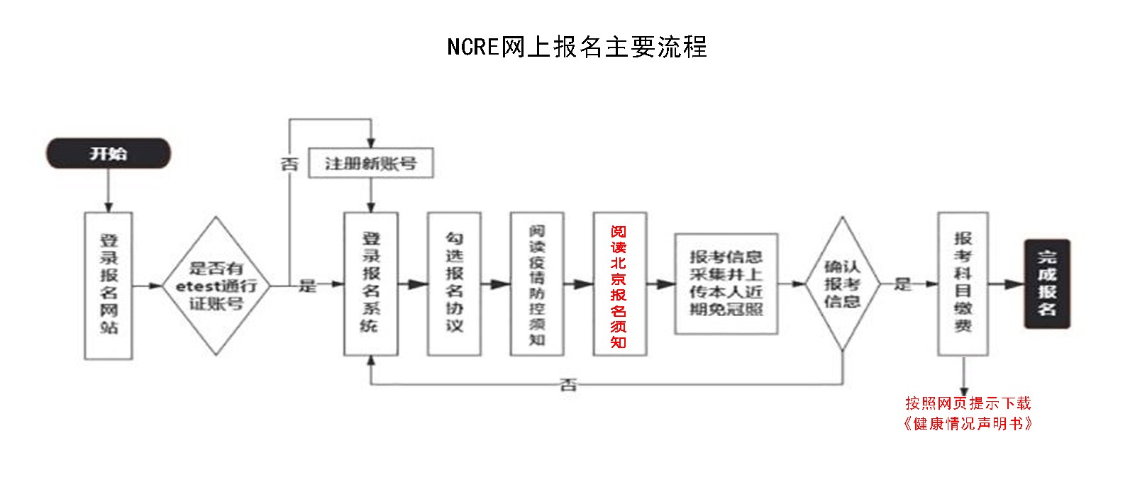 NCRE采取网上报名,报名考务费每科目75元。选择在北京市所属考点进行考试的考生,应登录全国计算机等级考试报名网站(网址:https://ncre-bm.neea.cn),点击“(11)北京市”报名入口进行网上报名,考生登录报名网站后,须认真阅读“省通告:北京市NCRE报名须知”,知悉并遵照报考及疫情防控相关事项要求,按照相关提示完成信息填写、照片上传、交费等程序。考生若已有账号,可直接登录报名;若没有账号,需登录ETEST通行证网站先进行账号注册。