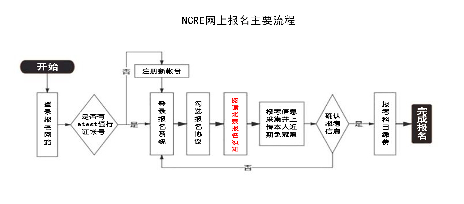 北京考生登录全国计算机等级考试报名网站(网址:https://ncre-bm.neea.cn),点击“(11)北京市”报名入口进行网上报名。考生若已有账号,可直接登录报名;若没有账号,需通过“ETEST通行证”网站进行注册。考生登录报名网站后,须首先阅读“省通告:北京市NCRE报名须知”等公告,知悉并遵照相关要求,按照网页提示完成信息填写、照片上传和缴费。