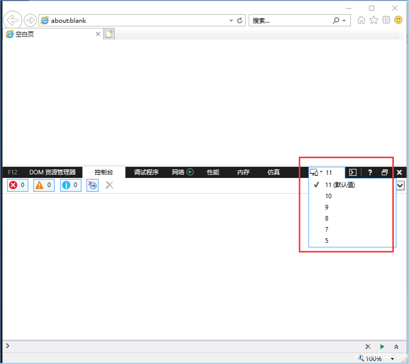 打开IE浏览器,点击F12键,会出现浏览器模式设置,要求此处设置的版本必须与浏览器实际版本一致。