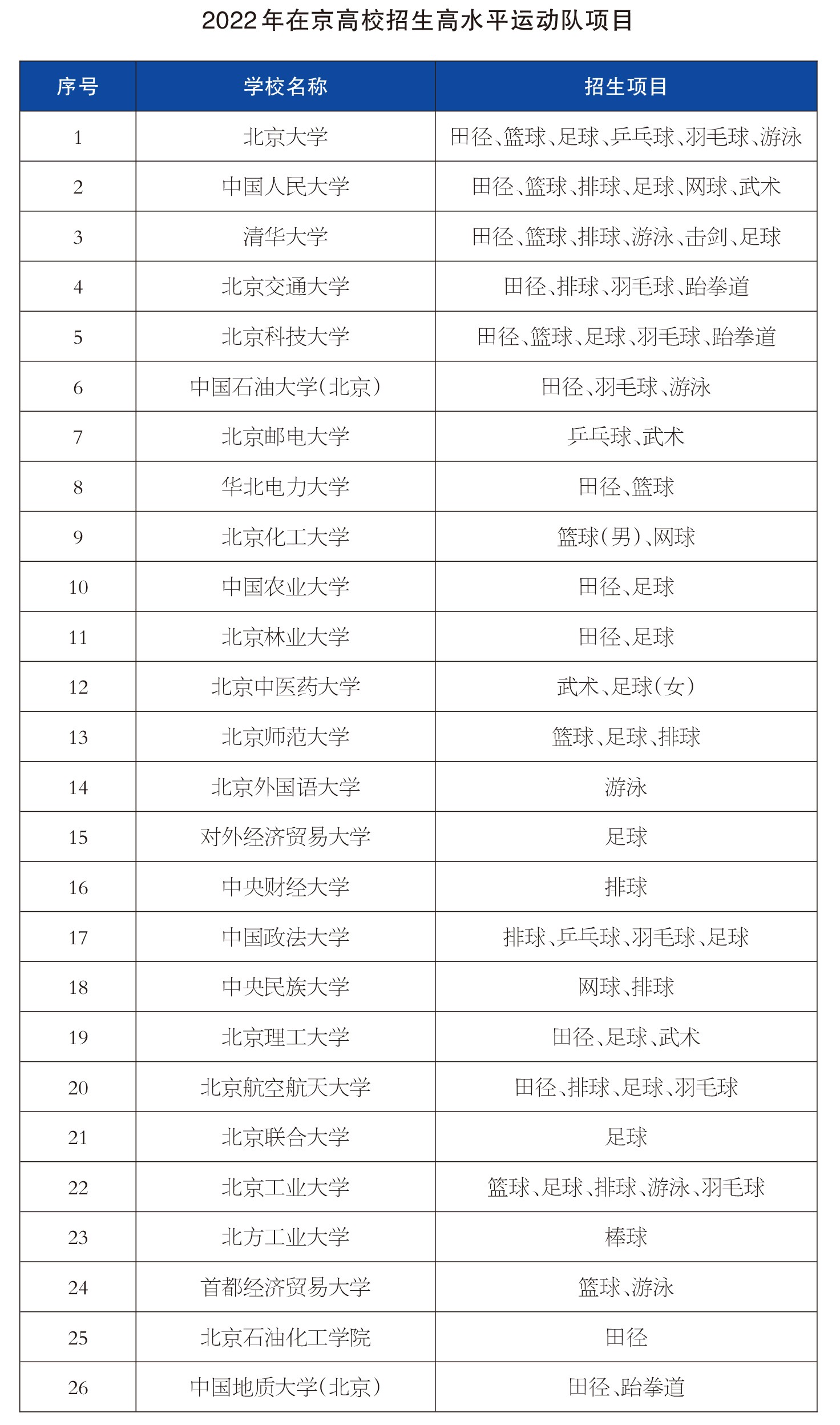 北京考试报讯(记者 许 卉) 记者从优米国际娱乐获悉,2022年具有招收高水平运动队资格的在京高校有26所。