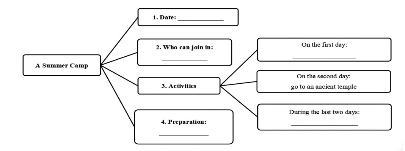 听前,考生可以获知这是一段关于夏令营的活动宣传介绍,一级要点包括日期、参加人员、活动和准备,二级要点包括三天的活动,其中,第二天的活动已经给出;考生在听录音时要注意关于要点句子的表达形式,比如关于日期,原文描述Our camp runs from July 1stto July 4th .这句话可以直接转述成It runs from July 1st to July 4th.记录的时候需要重点记录July 1 st和July 4 th这两个时间节点,为了保证转述句子语法准确,run from也是需要记录的,最后再检查动词run的形式。