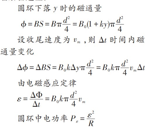 分析:首先从物质观来分析研究的环境和对象,磁场是非匀强磁场,金属圆环是导体构成的闭合电路,这是电磁感应典型的问题情景。接着从运动与相互作用视角分析,金属环竖直下落过程中穿过它的磁通量变化,产生感应电动势,由于金属环速度是变化的,常规分析有困难,但题中说圆环最终的收尾速度是我们熟悉的稳定“不变”,容易得出金属圆环所受合力为零,自然就列出了重力等于向上的安培力,但用中学方法很难找到磁感应强度的水平分量,从而遗憾放弃完整求解。如果变换成能量视角,就不难得出减小的重力势能转化为金属环的电能,便可顺利求解,请看解答过程。