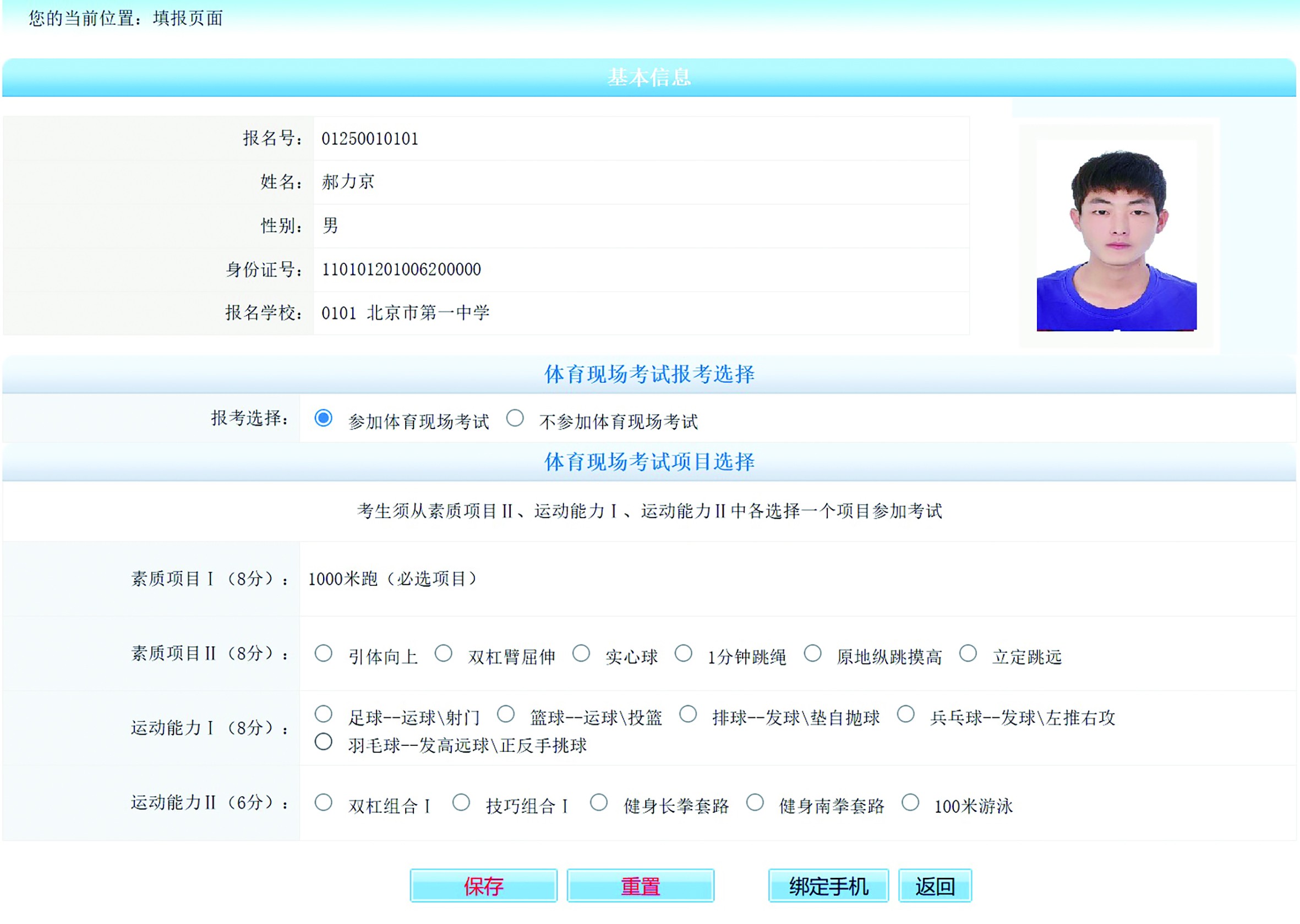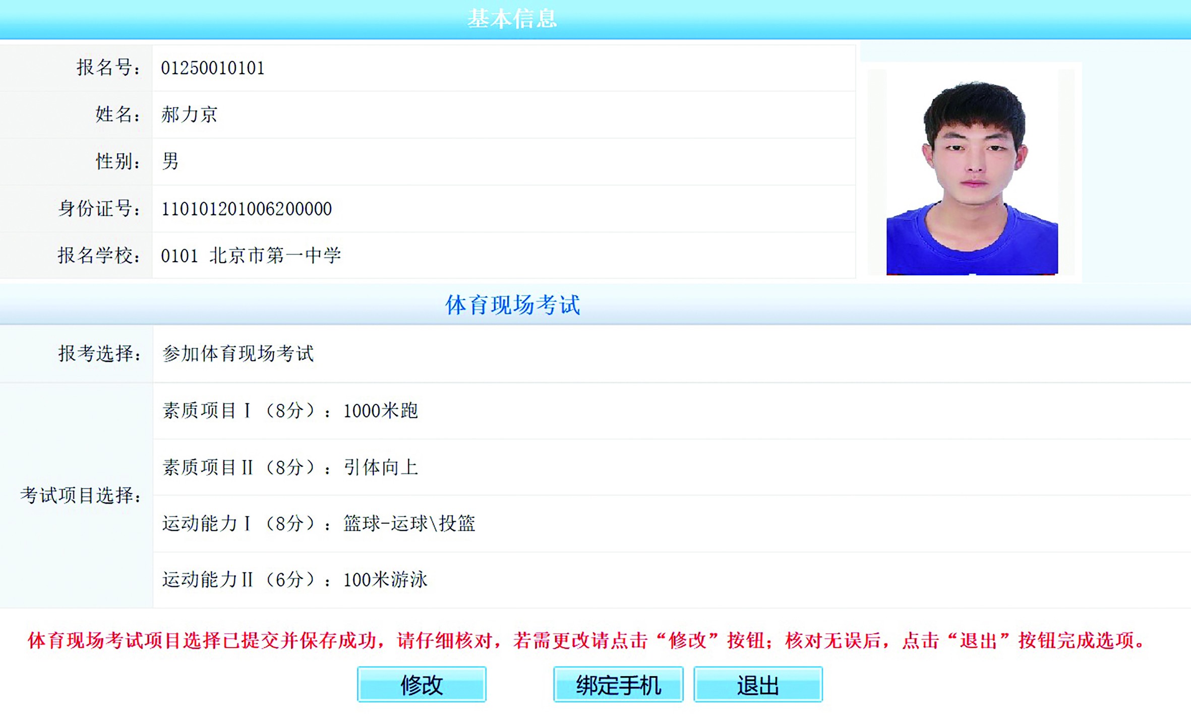 预览页面会显示考生已经提交并保存成功的体育现场考试报考选择和考试项目选择信息,考生要认真核对。