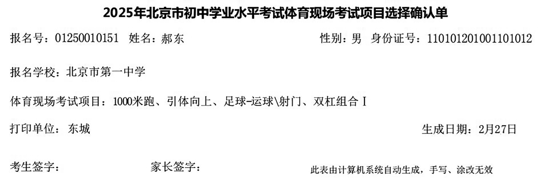 2月26日,初中学业水平考试体育现场考试项目选择结束后,学校将下载并打印“2025年北京市初中学业水平考试体育现场考试项目选择确认单”,考生及家长签字确认后要交回学校。