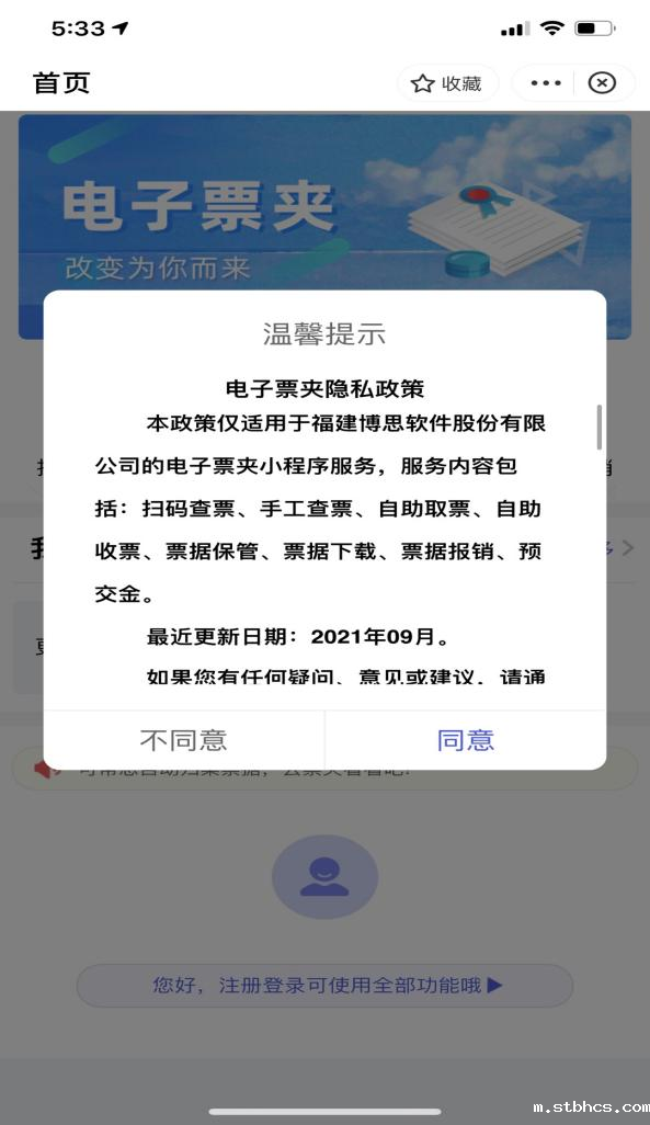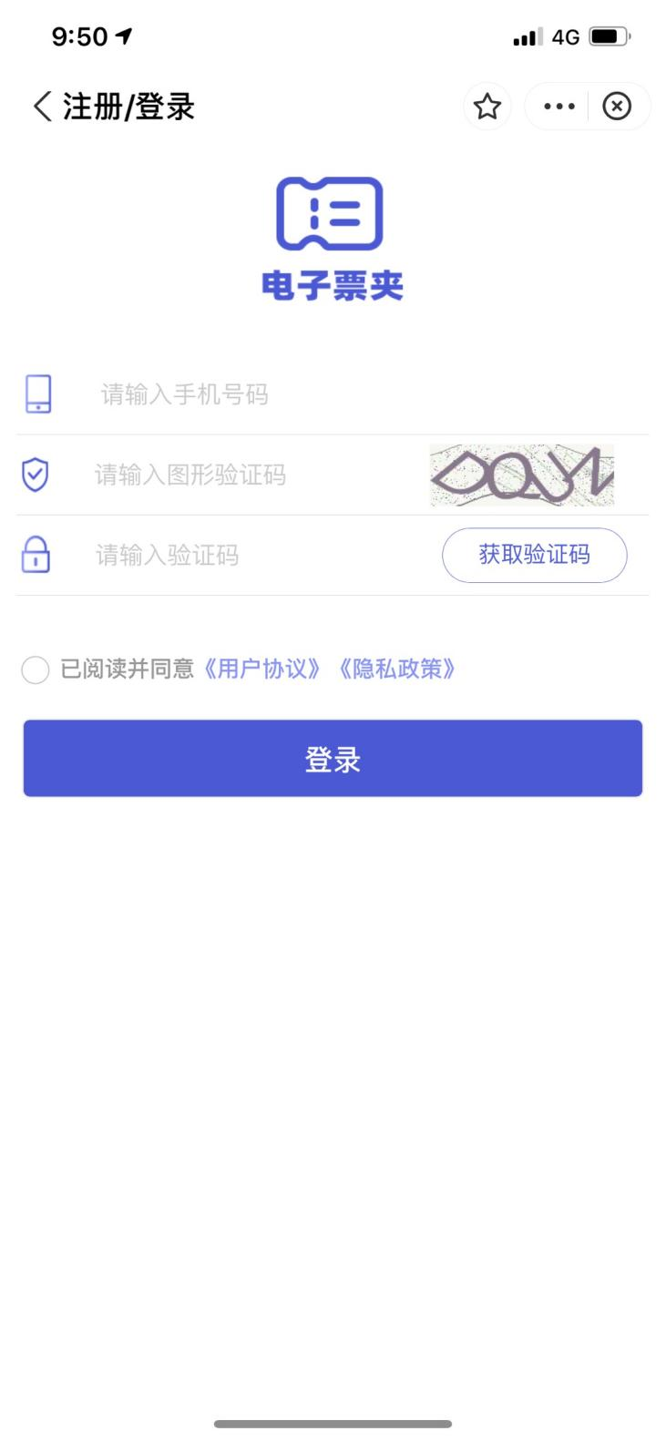 首次进入电子票夹小程序时会进入登录页。首次注册时需查看用户注册协议,隐私政策协议,点击【用户注册协议】【隐私政策】查看协议内容,点击勾选即表示同意协议内容。