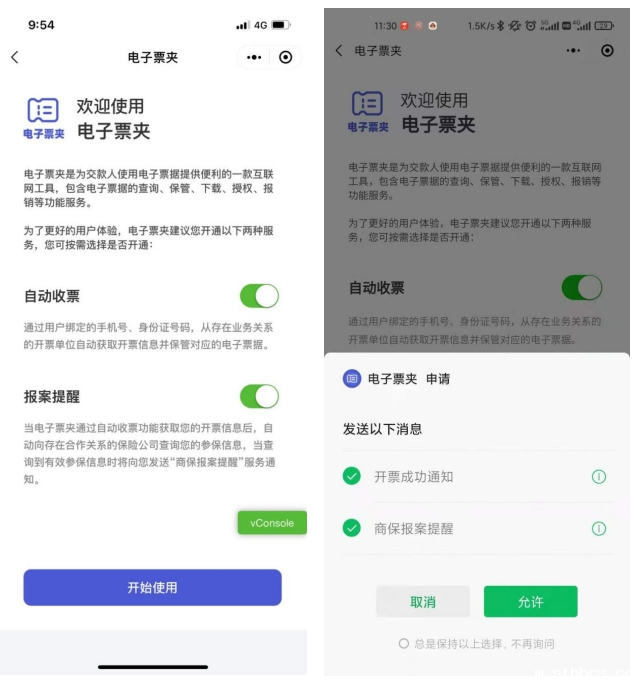 首次登录电子票夹会进入欢迎页,欢迎页面主要有自动收票、报案提醒的按钮,点击页面开始使用提示微信授权提醒,允许即可开通【自动收票】【报案提醒】,请开启自动收票功能。