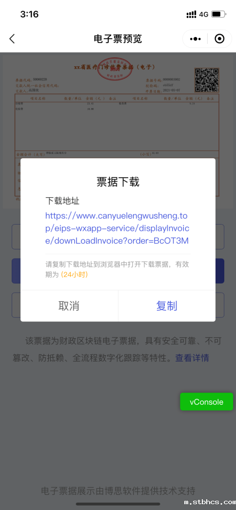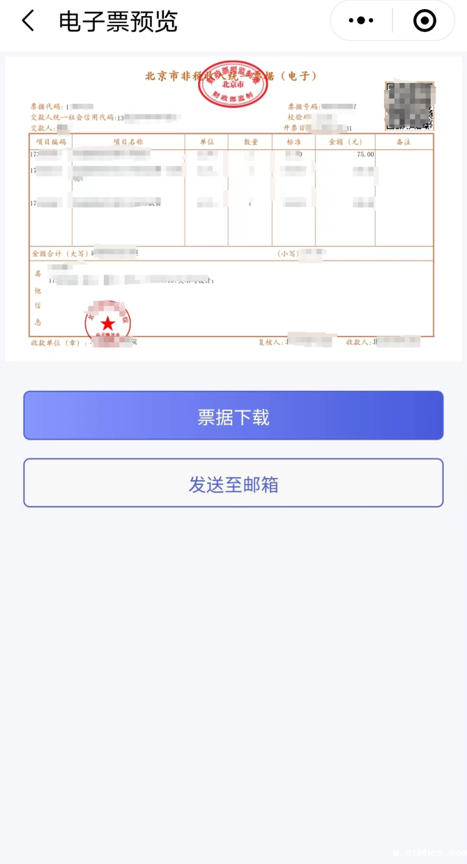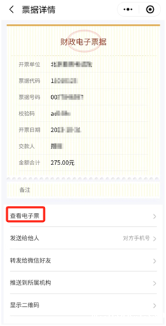票据详情页点击【查看电子票】,展示电子票据图片并显示【票据下载】、【发送至邮箱】按钮。点击票据放大显示票据图片。