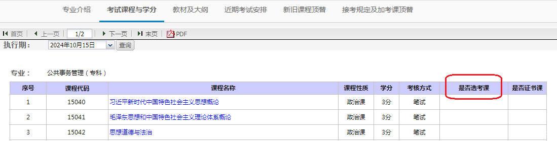 「考试课程与学分」是专业计划查询系统最重要的功能页面之一,显示了指定专业的课程设置情况。通过浏览该页面,考生能够知晓该专业申请毕业需要达到的课程门数和学分要求。