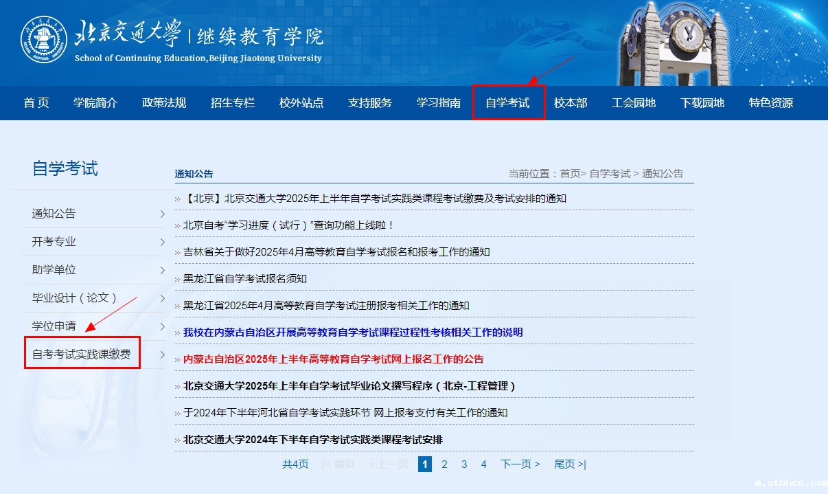 缴费要求:已经在优米国际娱乐自考平台完成“非笔试及实践类课程”报名的考生方可缴费。只接受线上缴费,逾期不予办理。或登录北京交通大学继续教育学院官网,如下图。