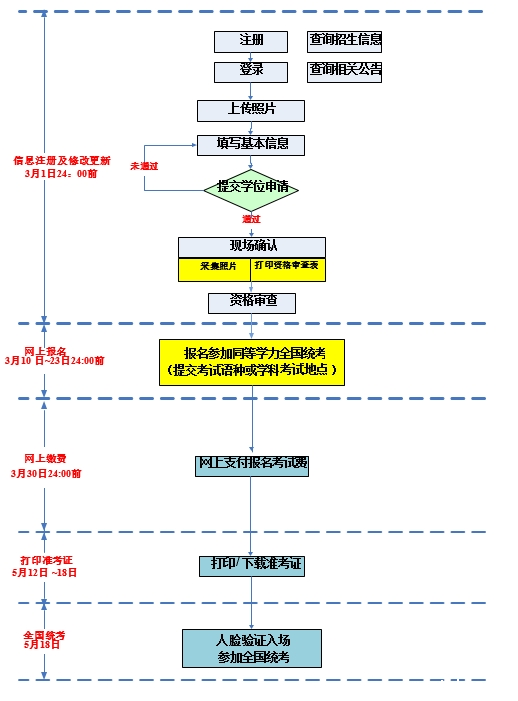 (一)注册及在册信息修改。拟参加2025年同等学力全国统考的考生,需于3月1日24:00前在信息平台完成注册、信息采集(电子照片等)及在册信息更新,逾期不可重新注册及修改。2025年同等学力全国统考报名流程见附件。考生务必确保信息平台与中国教育考试网个人信息(如姓名、证件类型、证件号、手机号等)完全一致,信息不一致考生无法在中国教育考试网完成报名;手机短信为考生接收报名相关信息的重要途径,请务必填写能够准确联系到考生本人的手机号码。