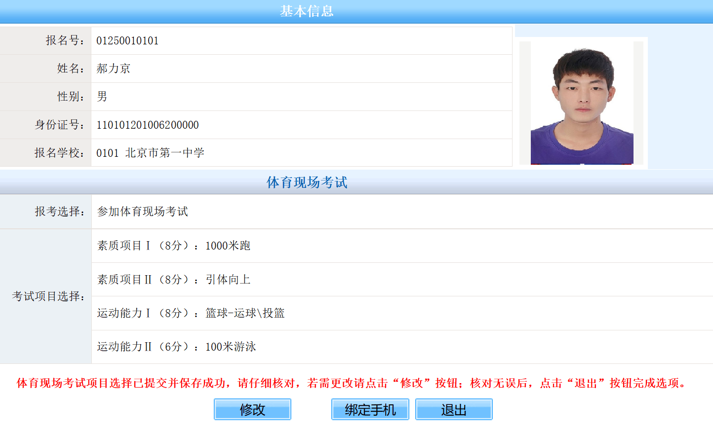 预览页面显示考生已经提交并保存成功的体育现场考试报考选择和考试项目选择信息,请考生认真核对。