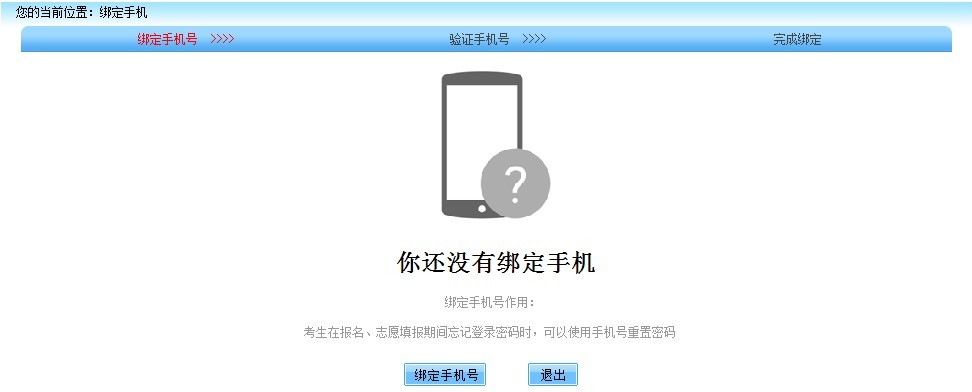 考生志愿填报期间可以绑定手机号,忘记登录密码时,使用手机号重置密码。绑定手机操作步骤如下: