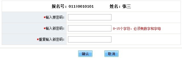 考生输入原密码(字母区分大小写)、新密码、重复输入新密码,新密码和重复输入新密码必须一致。新密码必须为数字和字母的组合,长度为8—15位,输入完成后点击“确认”按钮,输入正确后密码修改成功,返回登录页面。
