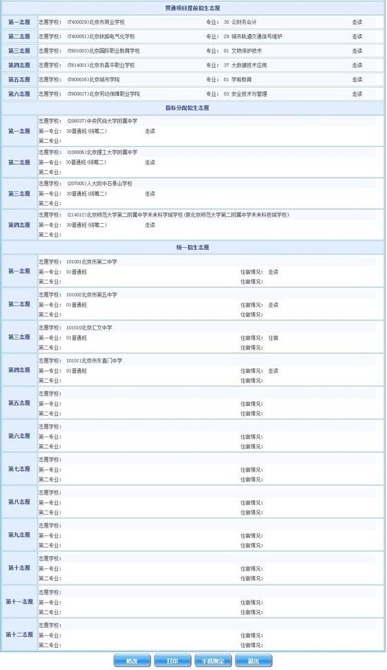 点击【打印】按钮生成中考志愿信息填报表,使用A4纸打印。